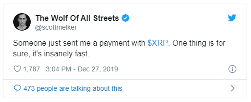 The initial tweet came in response to a post made by Scott Melker who shared that he had received a payment in XRP and said that this coin works extremely fast.